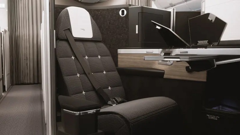 Each seat is arranged in a 1-2-1 configuration, ensuring direct aisle access for all passengers. The seat itself is upholstered in a sleek, dark fabric, complemented by a polished finish that exudes sophistication. The layout includes a spacious work surface, a personal storage compartment, and a side table for added convenience. The seat reclines into a fully flat bed, measuring approximately 6 feet, 6 inches in length, suitable for most travelers seeking rest on a transatlantic flight.