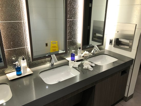 The lounge’s restroom facilities are located toward the back-right corner. The men’s room was clean, modern, and well-maintained, with: